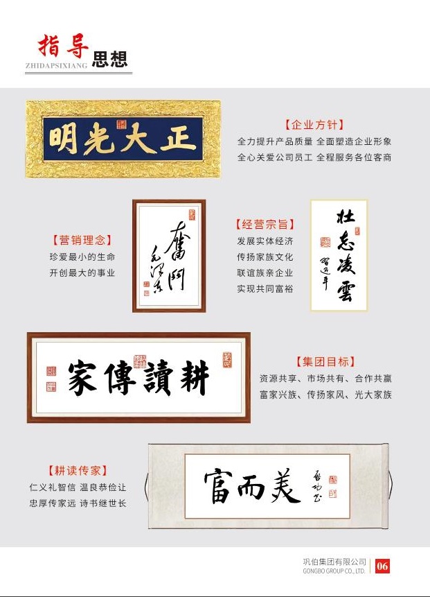 巩伯集团牢牢把握新时代经济社会发展方向,树立正确的社会主义核心价值观,坚持以国家大政方针为总纲,以做强国家民族产业为己任,以传承家族优秀文化为使命,秉承家风,牢记族训,立足山东,面向全国,名扬世界。